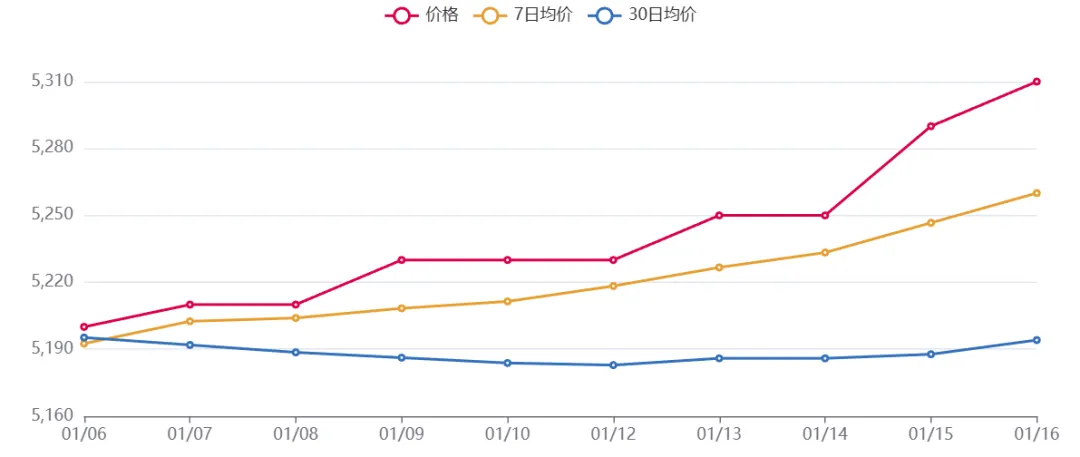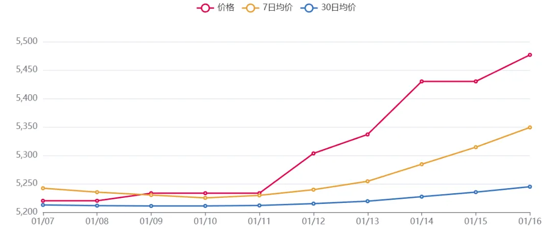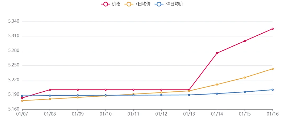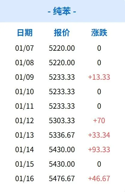 纯苯近十日价格呈现持续上涨趋势,上涨日为1月9日、12日、13日、14日、16日。