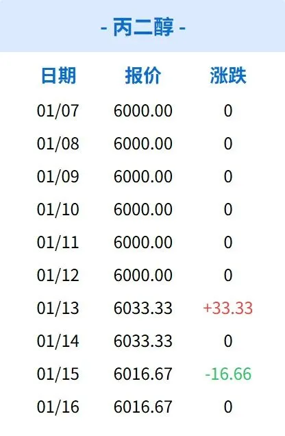 丙二醇近十日价格呈现先上涨后下跌趋势,上涨日为1月13日,下跌日为1月15日。