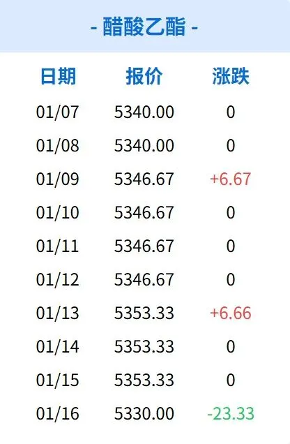 醋酸乙酯近十日价格呈现先上涨后下跌趋势,上涨日为1月9日、13日,下跌日为1月16日。
