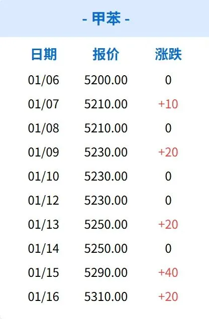 甲苯近十日价格呈现持续上涨趋势,上涨日为1月7日、9日、13日、15日、16日。