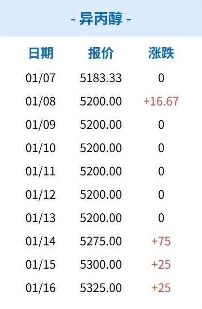异丙醇近十日价格呈现上涨趋势,上涨日为1月8日、14日、15日、16日。