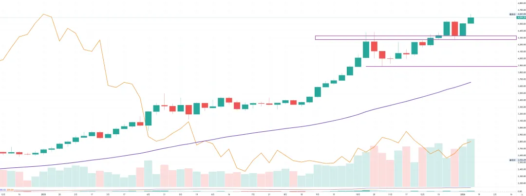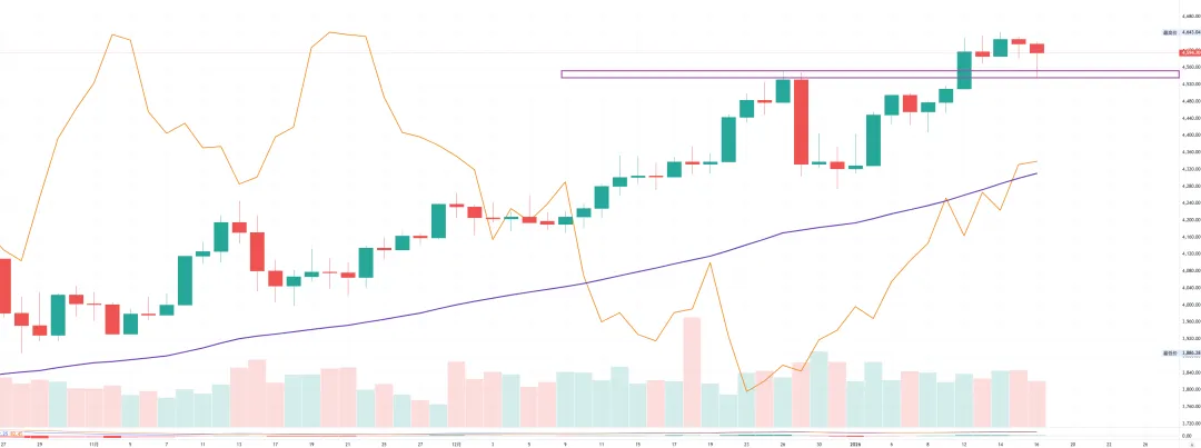 不过周五晚间,美国总统突然抛出不希望哈塞特出任新一届美联储主席的言论,瞬间拉掉黄金价格超过80美元幅度。但收盘前黄金多头及时完成防守反击动作,反而使周五日线收出了看涨锤子结构。