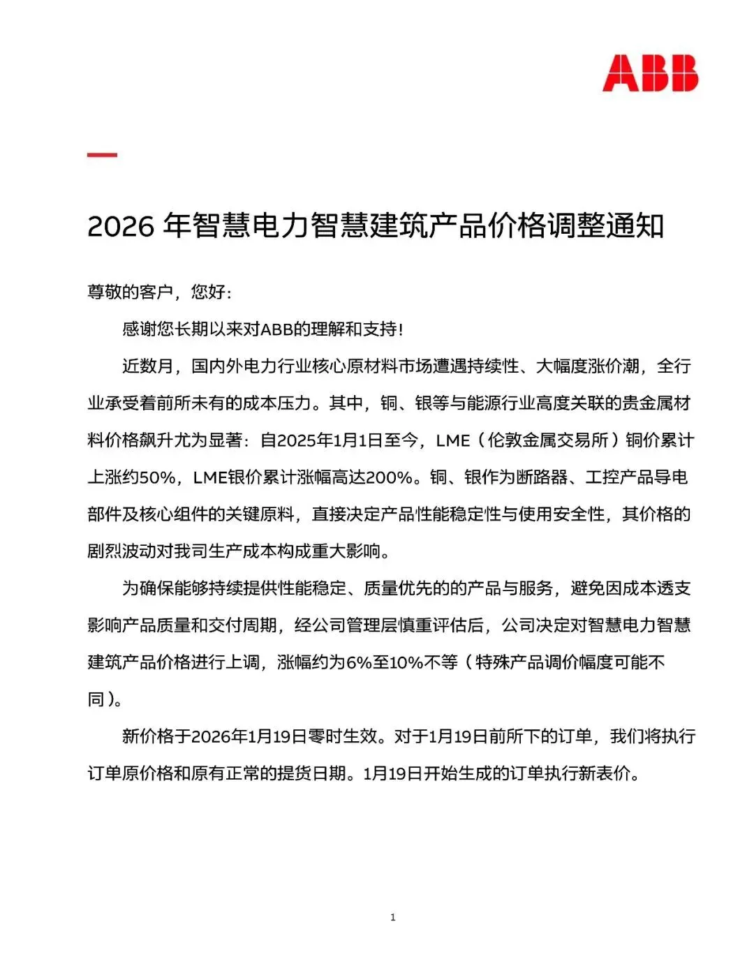 近数月,国内外电力行业核心原材料市场遭遇持续性,大幅度涨价潮,全行业承受着前所未有的成本压力。其中,铜银等与能源行业高度关联的贵金属材料价格飙升尤为显著:自2025年1月1日至今,LME(伦敦金属交易所)铜价累计上涨约50%,LME银价累计涨幅高达200%。铜,银作为断路器,工控产品导电部件及核心组件的关键原料,直接决定产品性能稳定性与使用安全性,其价格的剧烈波动对我司生产成本构成重大影响。