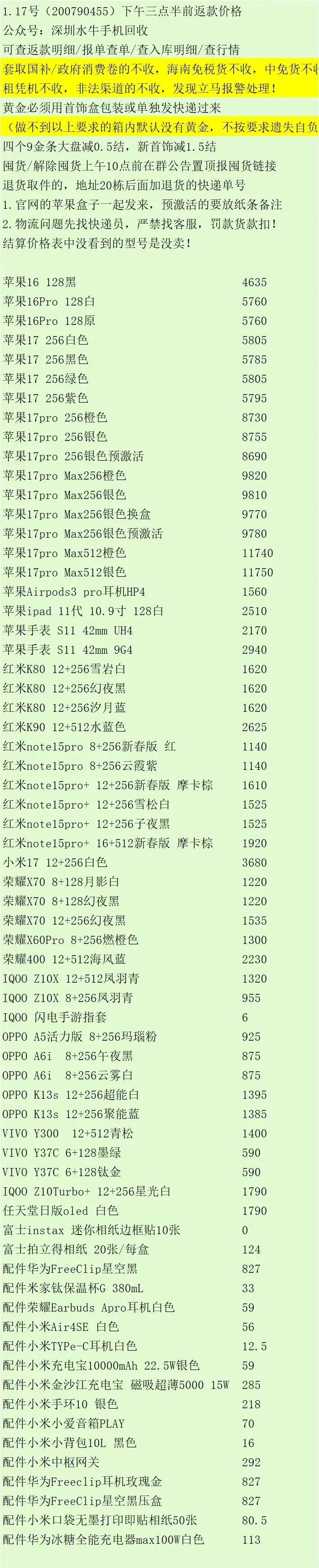 返款价格上面没有的型号颜色也收,当天有到的才有出结算价格。