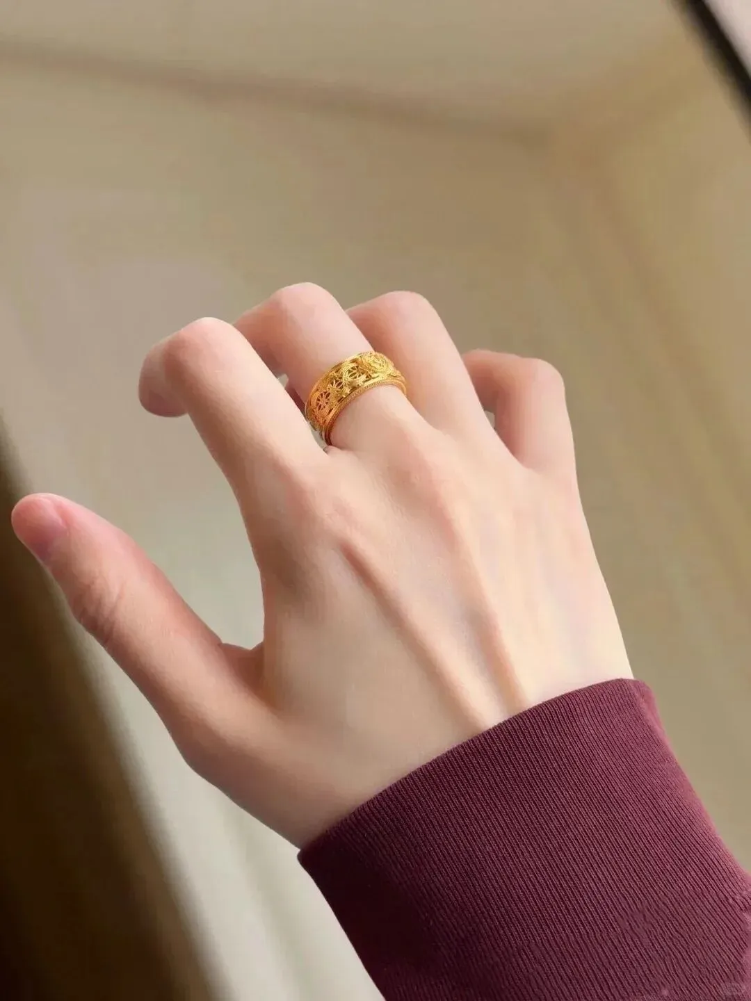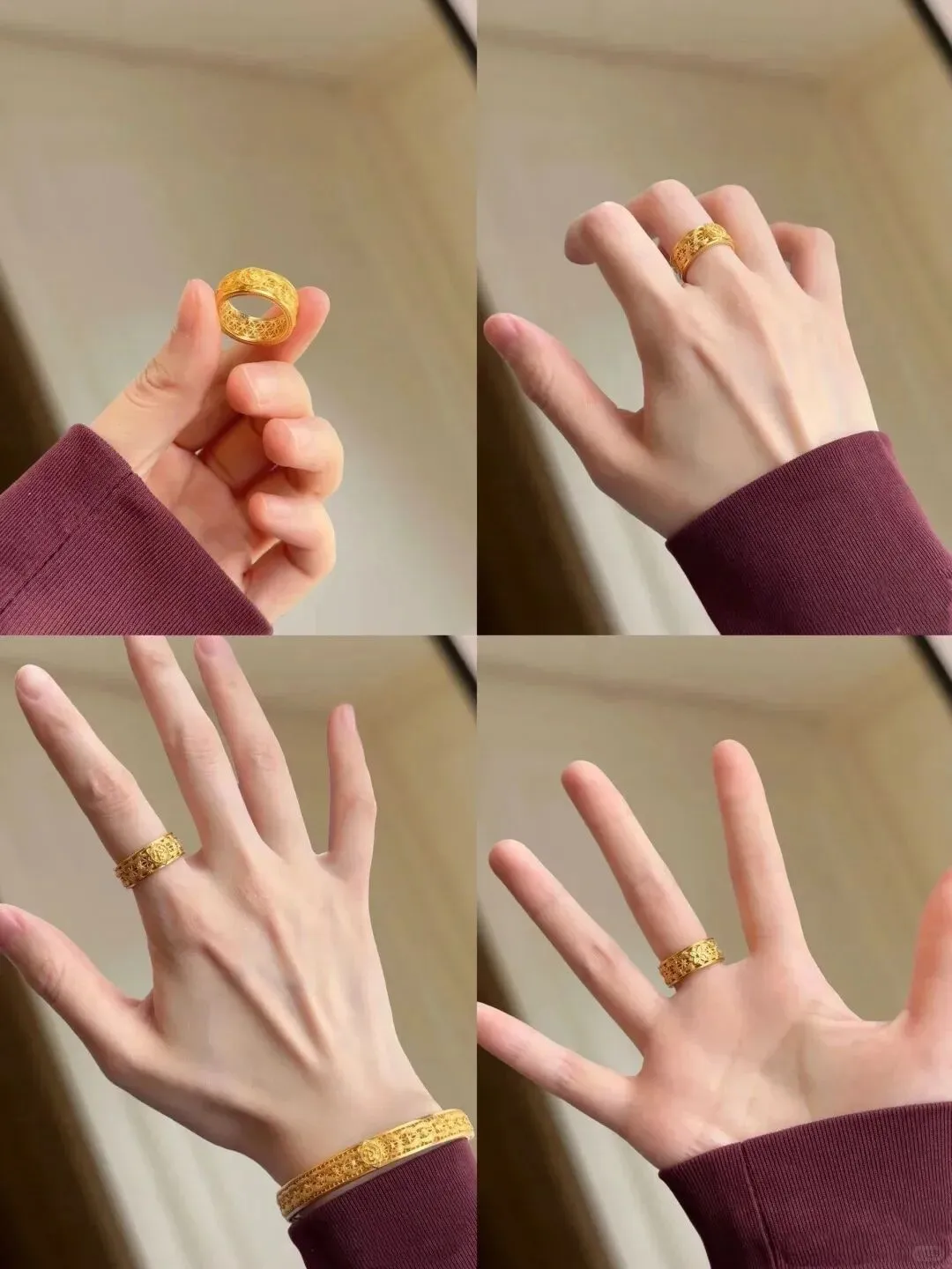 最惊喜的是它的“心机显瘦”效果——宽版设计天然修饰手型,我这种肉肉手戴上,手指瞬间看起来修长两厘米!朋友聚餐时还被问是不是偷偷做了手指SPA🤣。