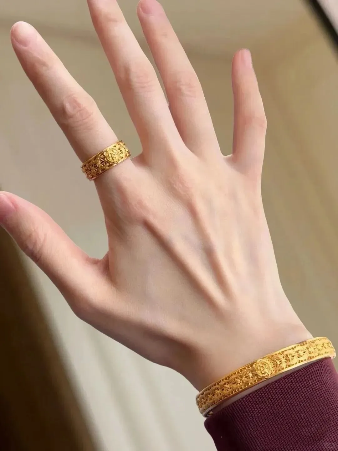 先给你们扒清楚参数!戒指是足金999材质,我称过单只重量大概在4.5克左右(不同圈口会有浮动哦),按今天金价算下来真的超友好!重点来了——它用的是5G工艺,表面是那种带磨砂感的哑光金,比普通黄金更耐磨不说。