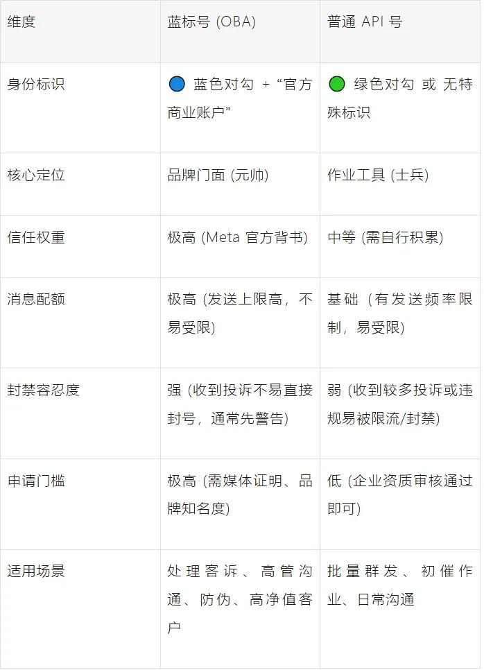 但很多从业者都会困惑:同样是WABA账号,蓝标号(OBA)和普通API号到底该怎么选?什么时候用蓝标,什么时候用普通号?用错了不仅浪费成本,还可能导致账号被封、业务停摆。(OBA是API号的一种,不过更高级一些)