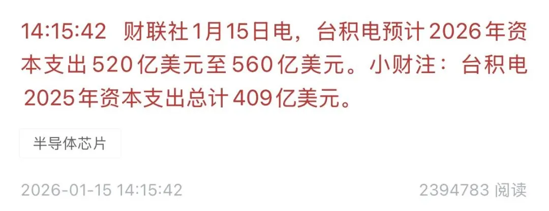作为半导体行业审慎的台积电上调了2026年资本开支,经历台积电和全球关联网大厂调研后确定了AI算力未来需求激增可以支撑整个半导体行业的需求上调,之前不上调是因为传统消费电子手机、电脑等需求拐点不明显,现在台积电的扩产计划正式确定了半导体行业进入了景气周期。