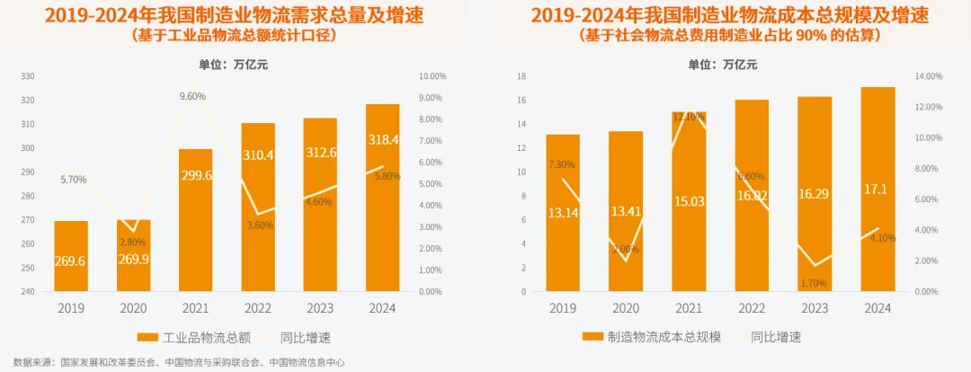 近年来,我国制造业物流需求总量呈现增长态势。根据中国物流与采购联合会数据显示,2024年全国社会物流总额360.6万亿元,其中工业品物流总额318.4万亿元,增长5.8%。