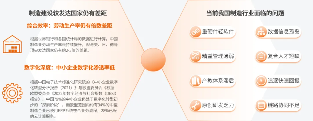 但我国制造建设较发达国家仍有差距。根据世界银行和各国统计局的数据进行计算,中国制造业劳动生产率虽持续提升,但与美、日、德等顶尖发达国家仍有约2-3倍的差距。根据中国电子技术标准化研究院的《中小企业数字化转型分析报告(2021)》与欧盟委员会《根据欧盟委员会《2022年数字经济与社会指数(DESI)报告》,中国79%的中小企业仍处于数字化转型初步的‘探索阶段’,而欧盟范围内约有34%的中型制造企业已使用ERP系统整合业务流程,28%已采纳云计算服务。
