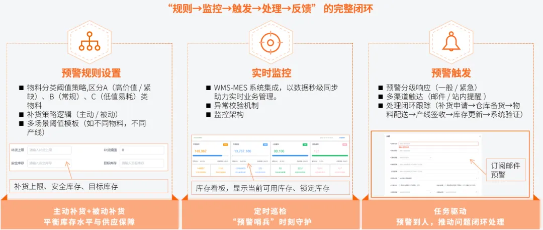 通过WMS与MES系统集成,建立线边仓库存预警机制,实时监控生产线物料消耗情况,自动触发补货指令,有力保障生产连续性,同时避免线边仓库存过高,实现精益生产。
