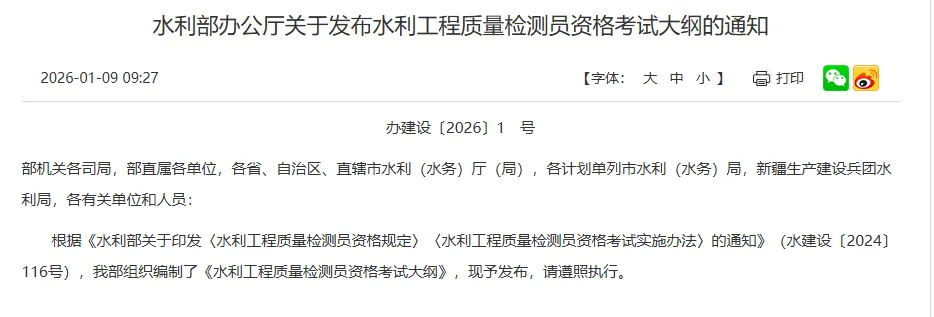 2026年1月9日水利部办公厅发布了《水利工程质量检测员资格考试大纲》。在回复网友的提问中,明确了考试大纲发布后6个月开展考试。该考试由水利部组织实施,水利部人才中心承担考试考务具体工作,具体报名和考试时间以考试公告为准。考试大纲共分为两部分,一部分是基础科目,一部分是专业科目。