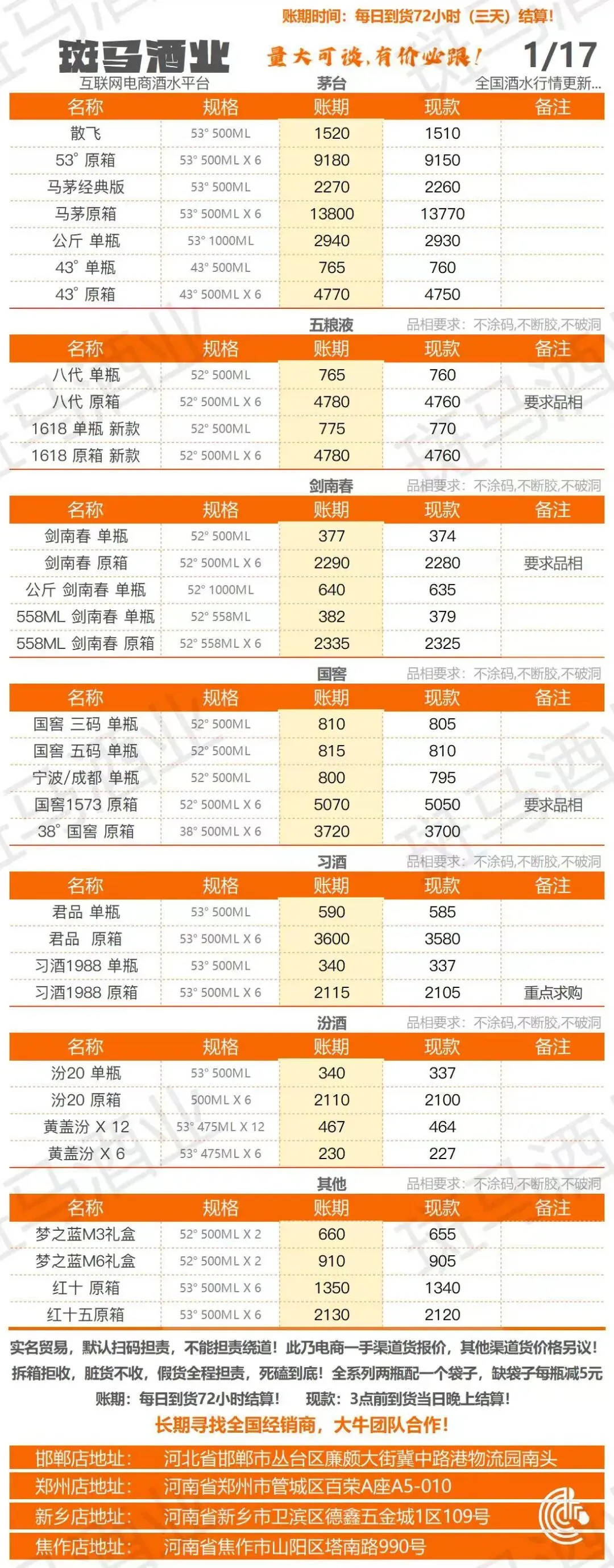 斑马酒业 26 .1 .17 采购行情报价