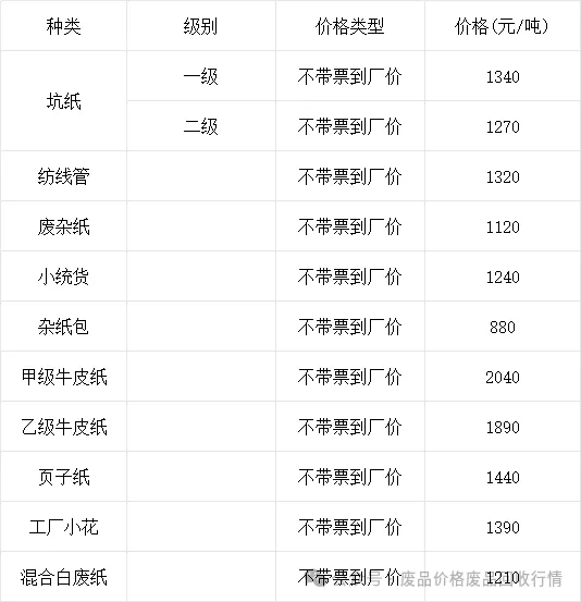 山东丰源中盛纸业(1月18日起),书页纸价格涨50,书本通货不变。废纸价格调整为:书本通货厂价:1460元,书页纸厂价:1550元。甲牛打包件1910元/吨(散货1880元/吨),次牛打包件(单面牛皮纸)1870元/吨(散货1840元/吨),特级纸1540元/吨、AA级1480元/吨,A级1460元/吨,A1级1450元/吨,B级1420元/吨,外地书本通货厂价:1460元,书页纸厂价:1550元。甲牛打包件1910元/吨(散货1880元/吨),次牛打包件(单面牛皮纸)1870元/吨(散货1840元/吨),特级纸1590元/吨、AA级1490元/吨,A级1470元/吨,A1级1460元/吨,B级1430元/吨。备注信息:各供应商一定要控制好送货质量,如发现垃圾、湿货扣点加重,白废中禁止含有切边胶条,含有严重影响质量的造纸禁含物将给予罚款。福建港兴纸业(1月18日起),纯大管、长小管涨20。调整后执行: (1)纺线管到厂价: 纯大管1430元 长小管1370元 宝塔管1200元 工业大管1200元 注:车子请提前一天以文字方式报备,否则不予卸货,价格以第一过磅时间为准。严禁弄虚作假,望各位客户自觉遵守!江苏太仓玖龙纸业(1月18日起),A级下调10元/吨,白纸类统一下调20元/吨,其他不 变。调整后执行到厂价:纯牛皮纸2280;甲级牛皮纸二类2010;甲级牛皮纸三类1870;国废箱板纸挂面纸1530;国废箱板纸A级1520;国废箱板纸B级1500;B(DT统货)1450元;国废箱板纸C级1420;国废箱板纸D级1340;灰黄板1280;纺线管1360;小统货1250;废杂纸1120;国废纸芯1150;卷布管920;纯白双胶纸边1880;纯白统货1750;纯白卡铜版纸1650;一级白1600;页子纸1520元/吨;书本纸1410;小花卡纸1360元/吨;混合白废纸1390;大花1180;华南地区最高上调20元/吨