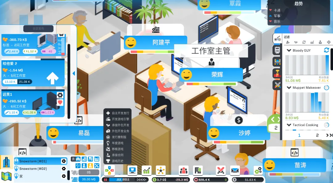 有的员工负责游戏研发,设计、开发、后期,身为管理者的你需要保证他们的技术平衡,不让游戏出现《蔑视》这种长板过长、短板过短的情况。人员扩张后,还需要招聘,人事、监制、会计、市场经理、网络管理员等职务,帮助你完成从游戏制作组到互联网公司的转变。