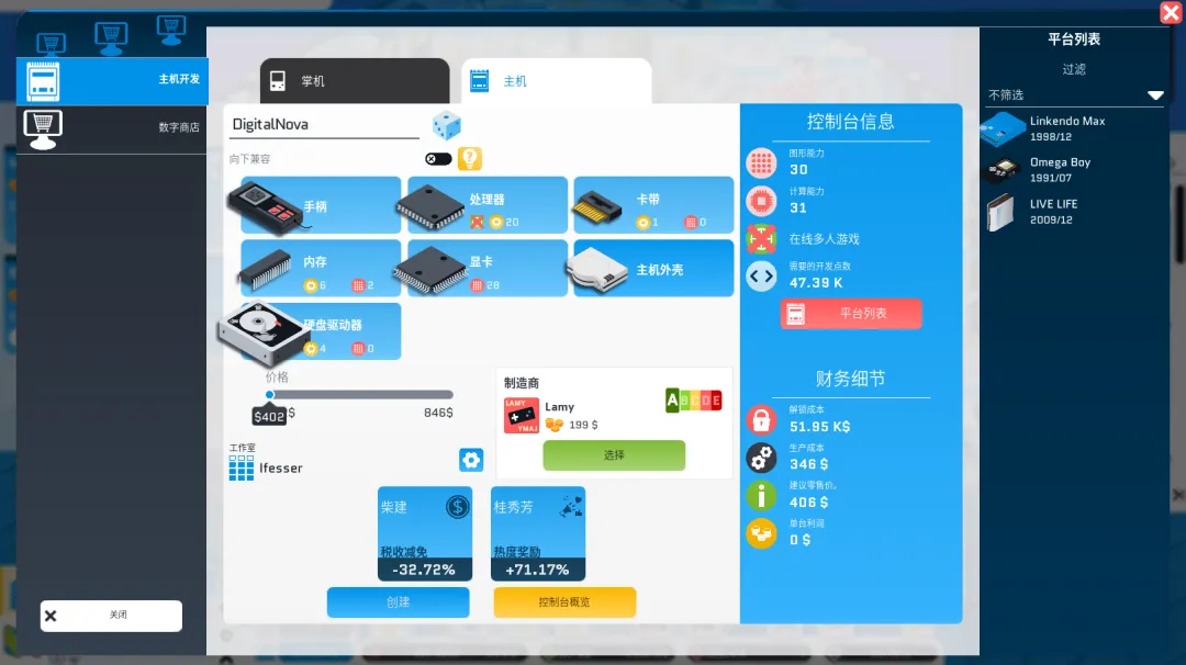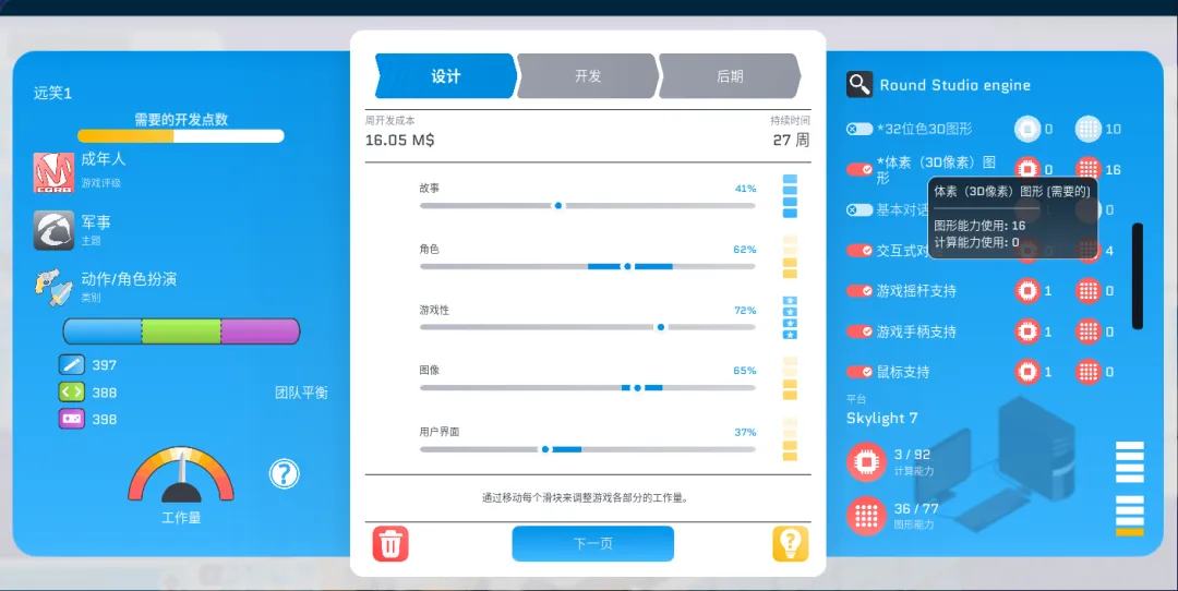 这一系统直接影响游戏最主要的Gameplay环节——发布平台的图形能力和计算能力,决定了你能在手头开发的游戏中植入哪些技术,影响游戏的化学、表现和评级,最终反应在游戏的销量上。