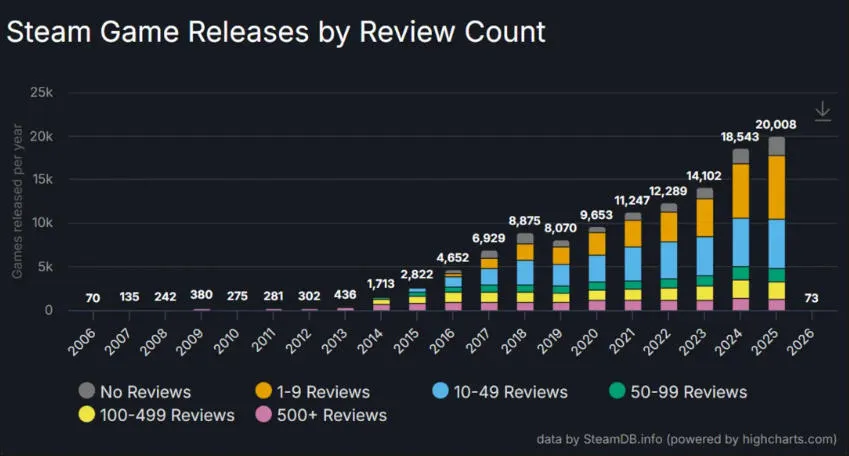 2025年一年,单在Steam(电子商店)上就发售了20,008款游戏(数据来自GameLook),其中能不亏钱的有多少?能小有盈利不至于白忙活的有多少?能人前显名被业界称道的又有多少?