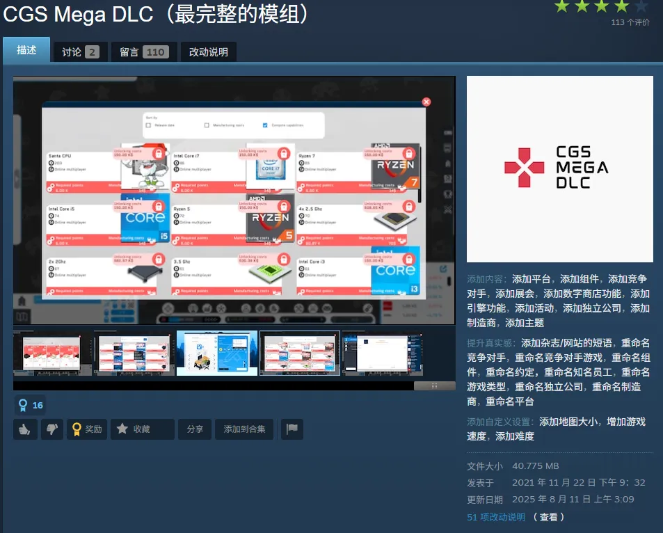 其中一个MOD引入了35个主机平台、600个游戏公司、100个引擎特性、25个数字商店特色、15个真实生活事件和8个游戏展,堪称资料片。