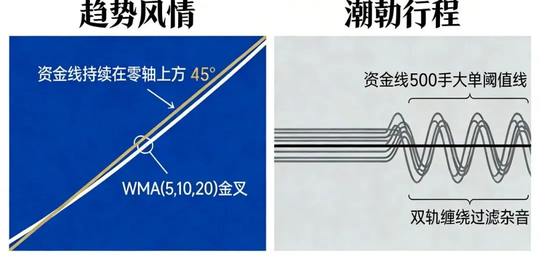 特征:金色趋势线持续向上倾斜(斜率>45°),白色资金线始终在零轴上方运行,二者同步抬升无背离。如2024年3-5月的某AI算力股(2024.03.10-05.20),期间趋势线保持强势斜率,资金线连续28日净流入,双轨同步发出持股信号。