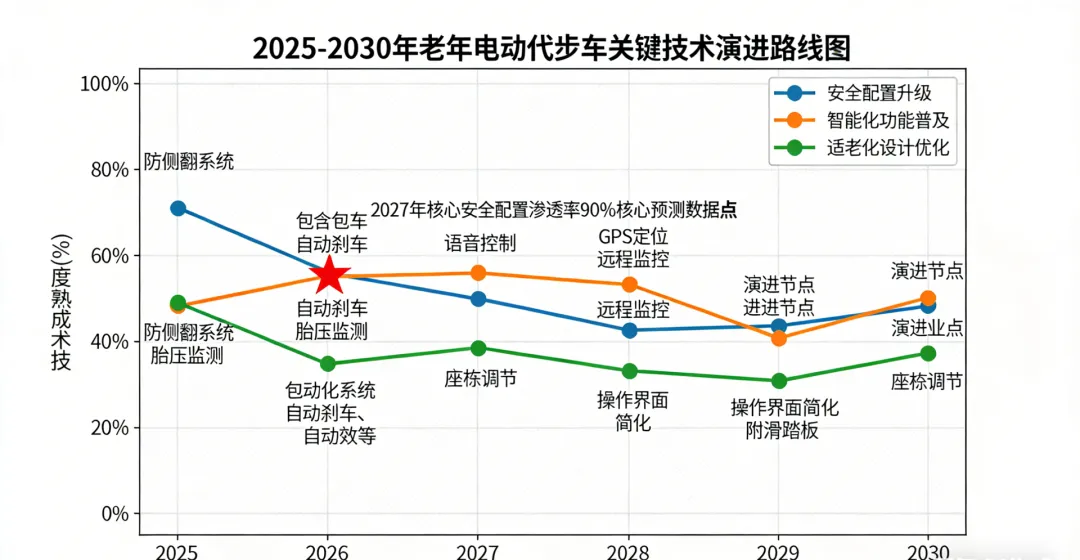 未来3-5年,老年电动代步车将向“高安全、强智能、适老化”方向深度迭代。安全技术方面,车身防撞结构、防自燃电池、防误操作控制系统成为标配,预计2027年核心安全配置渗透率达90%,车辆碰撞合格率从当前的45%提升至85%(数据来源:基于新国标要求及行业技术升级趋势预判)。智能化技术加速应用,参照两轮电动车智能化趋势,北斗定位、远程监控、动态安全检测等功能将普及,部分高端车型可实现跌倒报警、健康数据联动等适老功能(数据来源:界面新闻《2025年中国两轮电动车行业研究报告》)。适老化设计进一步优化,如加大操作按钮、简化控制系统、提升座椅舒适性等,贴合老年群体使用习惯。