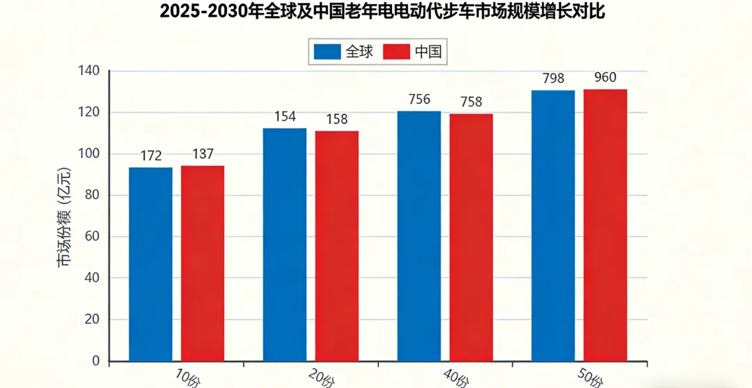 在安全标准与政策补贴双重推动下,老年电动代步车市场将实现规范化扩容。国内市场方面,下沉市场成为核心增长引擎,三四线城市及县域老年人口占比超60%,合规代步车需求增速达一线城市的1.5倍,预计2025年市场规模突破380亿元,2030年达1200亿元,2025-2030年复合增长率达26.8%(数据来源:基于民政部老年人口数据及行业需求调研预判)。海外市场潜力持续释放,除高尔夫球车等转型产品外,合规老年代步车将借力“一带一路”拓展东南亚、南美等老龄化加速地区,预计2030年出口规模突破50亿元,较2025年增长180%(数据来源:基于山东企业出口数据及全球老龄化趋势预判)。