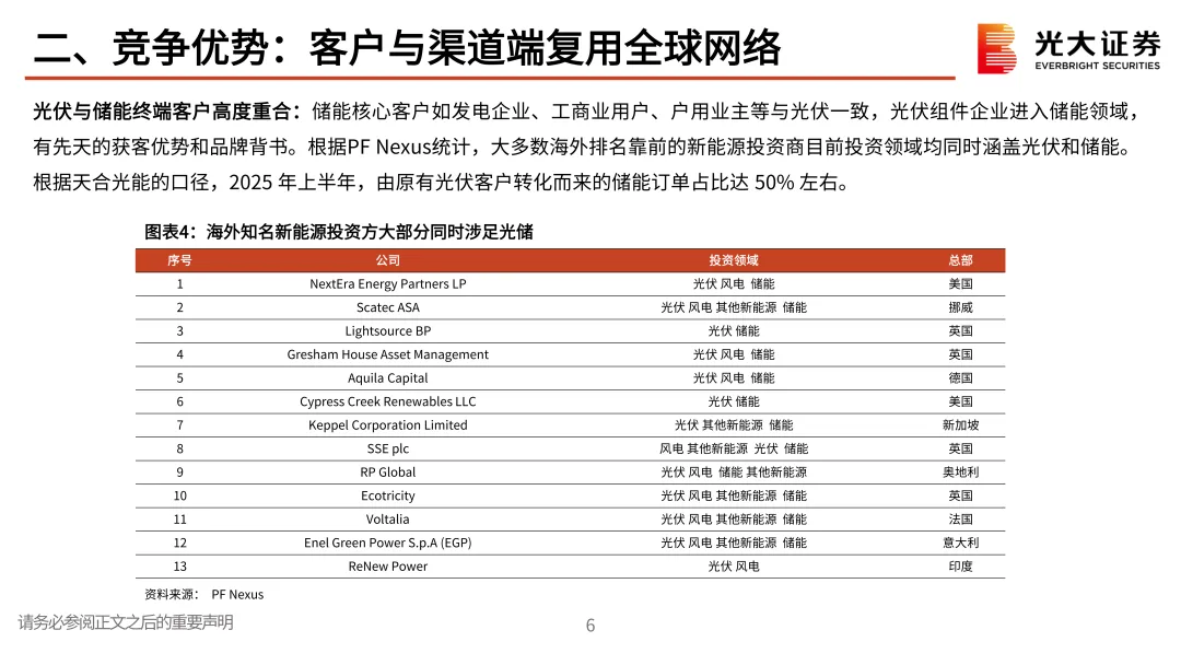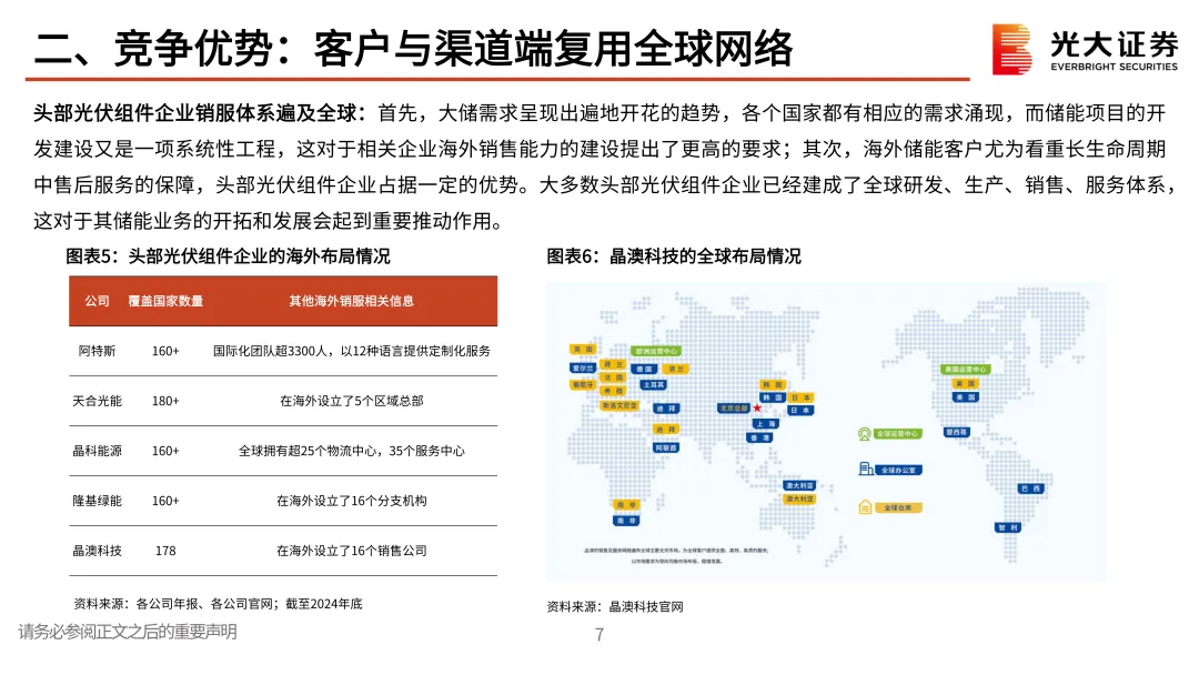 在客户和渠道端:光伏与储能终端客户高度重合,储能核心客户如发电企业、工商业用户、户用业主等与光伏一致,光伏组件企业进入储能领域,有先天的获客优势和品牌背书;头部光伏组件企业销服体系遍及全球,大多数头部光伏组件企业已经建成了全球研发、生产、销售、服务体系,这对于其储能业务的开拓和发展会起到重要帮助。