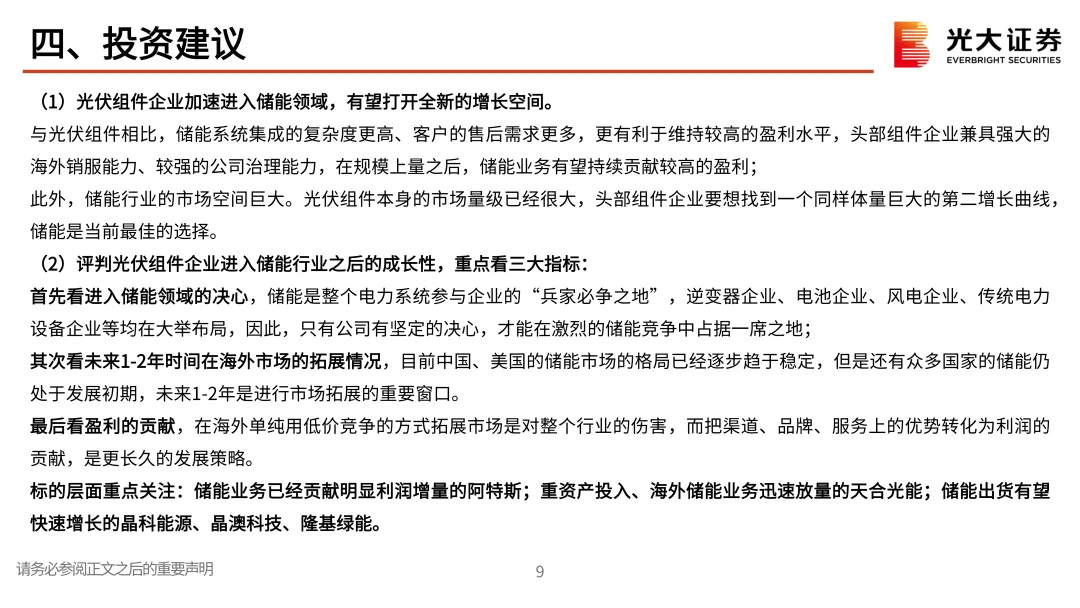 三、投资方面:(1)光伏组件企业加速进入储能领域,有望打开全新的增长空间。(2)评判光伏组件企业进入储能行业之后的成长性,重点看三大指标:首先看进入储能领域的决心;其次看未来1-2年时间在海外市场的拓展情况,目前中国、美国的储能市场的格局已经逐步趋于稳定,但是还有众多国家的储能仍处于发展初期,未来1-2年是进行市场拓展的重要时间窗口;最后看盈利的贡献,在海外单纯用低价竞争的方式拓展市场是对整个行业的伤害,而把渠道、品牌、服务上的优势转化为利润的贡献,是更长久的发展策略。标的层面重点关注:储能业务已经贡献明显利润增量的阿特斯;重资产投入、海外储能业务迅速放量的天合光能;储能出货有望快速增长的晶科能源、晶澳科技、隆基绿能。