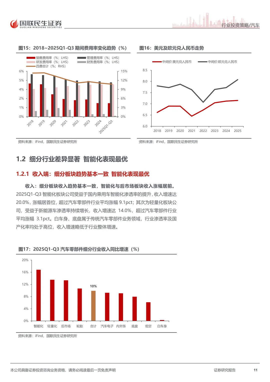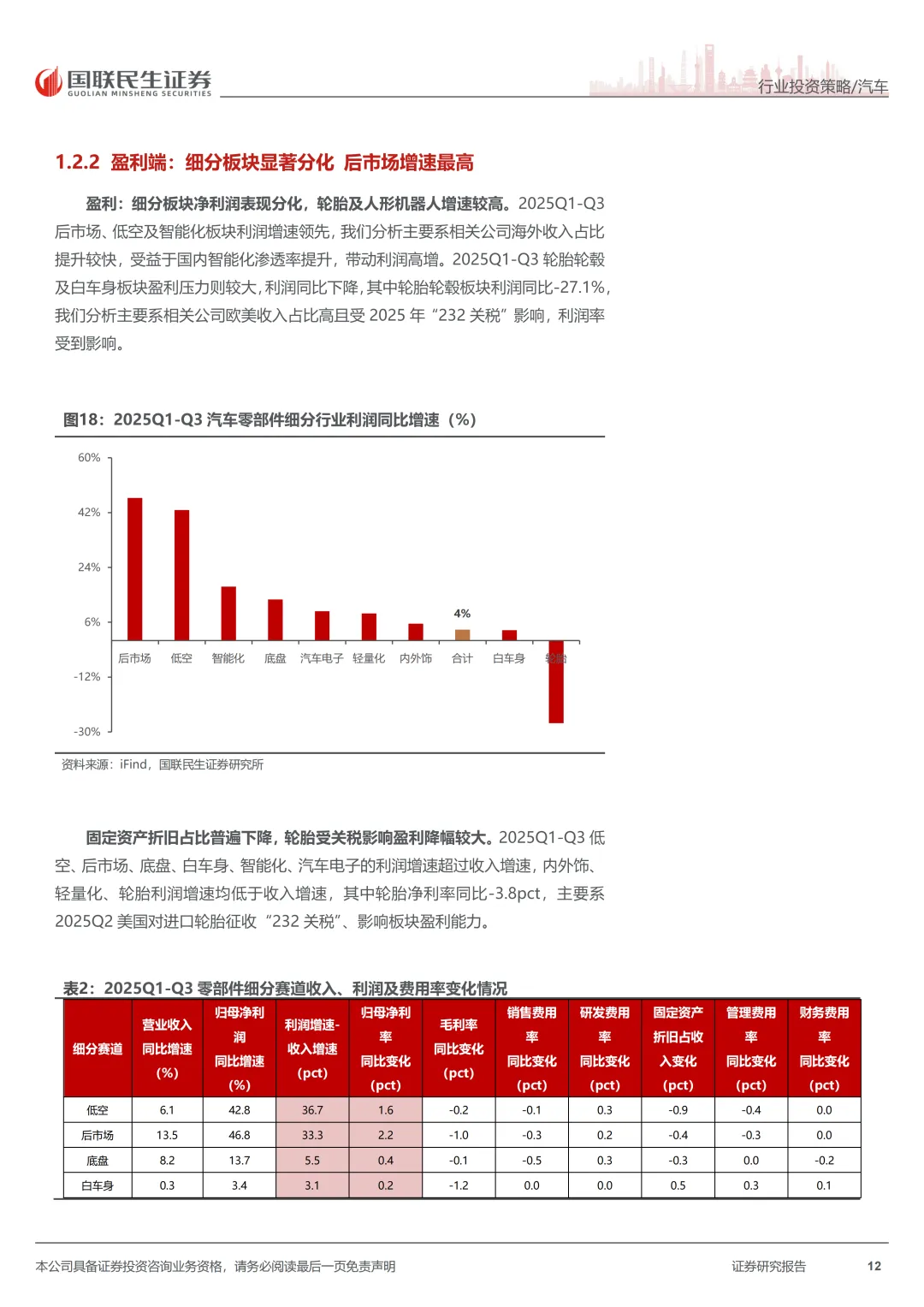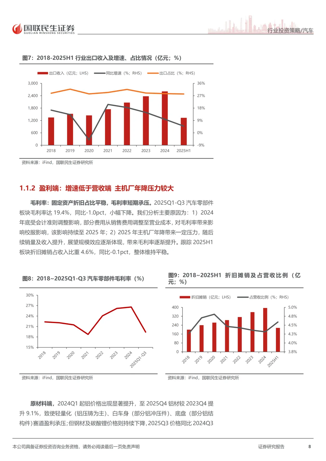 展望2026:智能化&全球化加速人形机器人百花齐放。回顾2025年,2025Q1-3国内批发2,116万辆、同比+13.3%,带动汽车零部件板块收入同比+8.3%;受自主品牌占比提升、年降压力较大影响,板块净利率同比-0.5pct。展望2026年,预计以旧换新政策有望延续、为需求提供支撑,2026年批发销量有望达到3,030万辆,同比+1.0%,带动汽车零部件公司收入向上。结构端,基于【国联民生汽车零部件五力模型】,整体来看智能电动化零部件>传统零部件,其中智能电动化零部件中,智能化>电动化>汽车电子;传统零部件中内外饰=底盘件>轮胎>白车身;新产业中人形机器人处于行业发展初期,空间大、变化大、波动大。