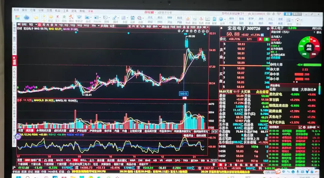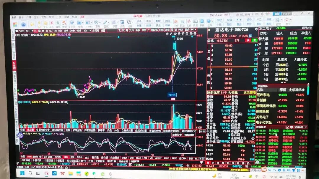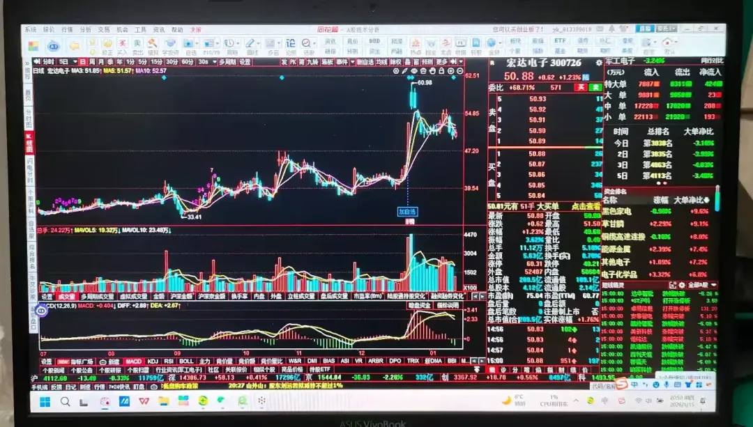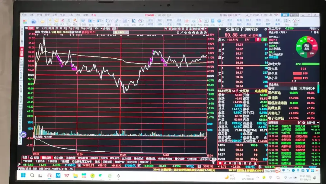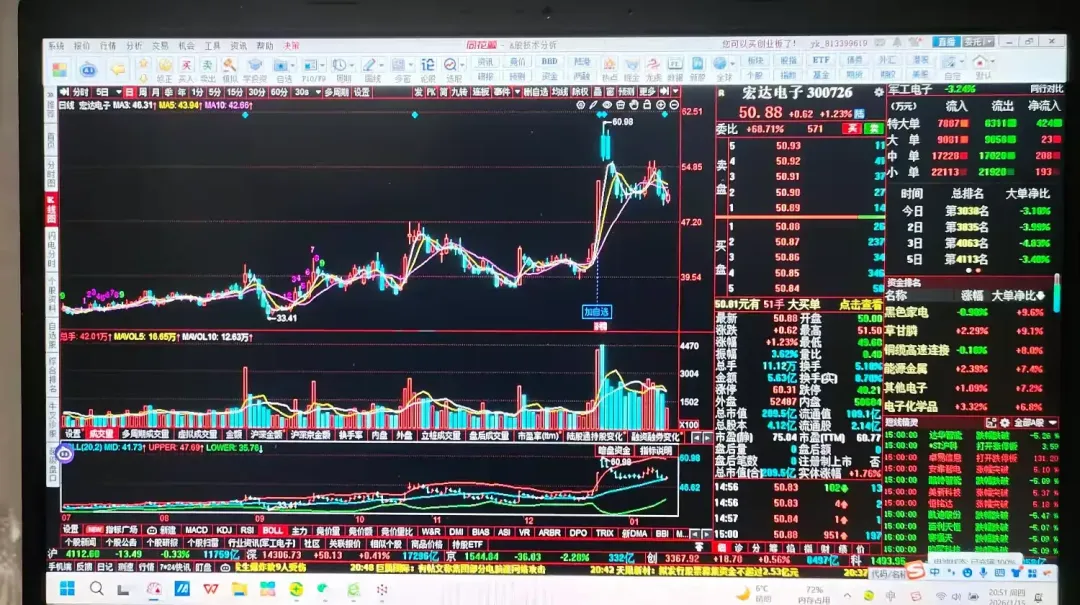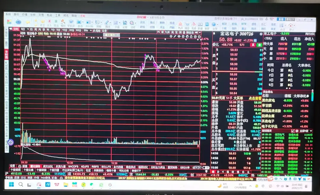 从分时线上看,早盘低开冲高回落,均价线下方震荡下行,上午收盘在均价线下方,午盘开盘5分钟左右创新低49.68元,后震荡上行均价线上方运行,收盘在均价线上方。从盘面上看:大单、中单、小单等户资金逆势净流入,呈现“主力出货、其他户接盘”格局。结论:宏达电子在2026年1月13日至15日呈现“下跌中继+消息驱动震荡”特征,未形成典型技术反转K线组合,但有重大投资公告释放长期信号。