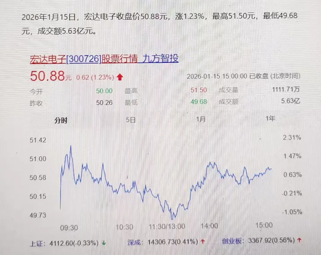 📉 背景根据2026年1月13日至15日的公开市场数据与公司公告,宏达电子(300726.SZ)在此期间并未出现涨停或明显放量上涨行情,反而经历了连续下跌后因重大利好公告停牌,整体表现为“利空消化+利好落地”。