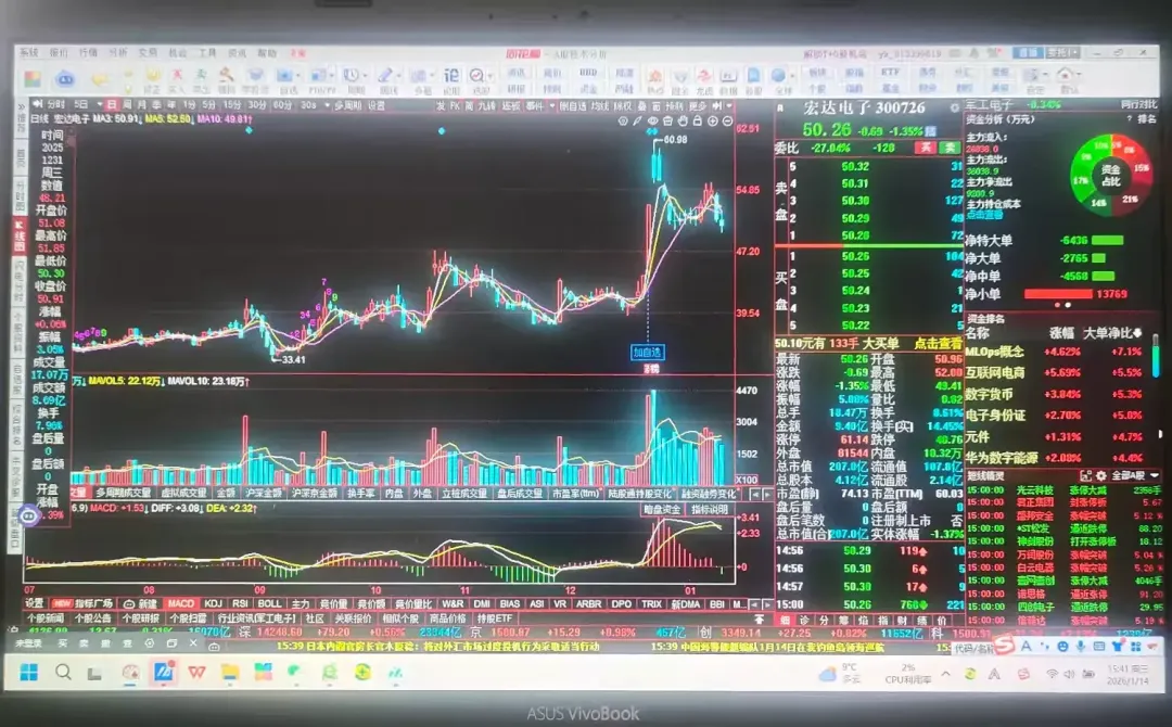 从分时线上看:2026年1月14宏达电子(300726)股票行情走势,开盘冲高回落,9:55分左右拉升52.00元横盘至上午收盘,13:00点开盘直接断崖式回落低点49,91元,14:15分左右拉升至收盘在均价线(50.87元)下方。