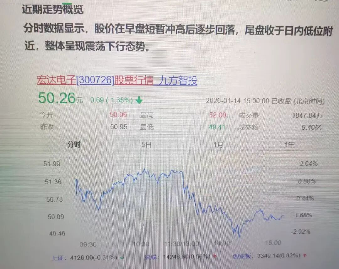 2026年1月14宏达电子(300726)股票行情走势,《三阳一阴》后,1月13日、14日宏达电子大阴线小阴线组合(不是十字星),继续回落概率大于上升。MACD/BOLL/KDJ/RSI等技术指标显示回落行情,MACD显示绿柱、BOLL上轨线和下轨线张口收缩,KDJ/RSI指标线显示下行迹象,也不排除宽幅震荡洗盘行情,给持股者带来心理上压力,为上升扫清或减去。当前股价宏达电子(300726)最新收盘价为50.26元,较昨日下跌0.69元(-1.35%),数据截至2026年1月14日15:00(已收盘)。成交信息当日成交额达9.40亿元,成交量为1847.04万股;最高价52.00元,最低价49.41元,今开50.96元,昨收50.95元。市场趋势分时数据显示早盘冲高后回落,尾盘跌幅扩大至-2.92%,整体呈现震荡下行走势,短期需关注50元整数关口支撑。