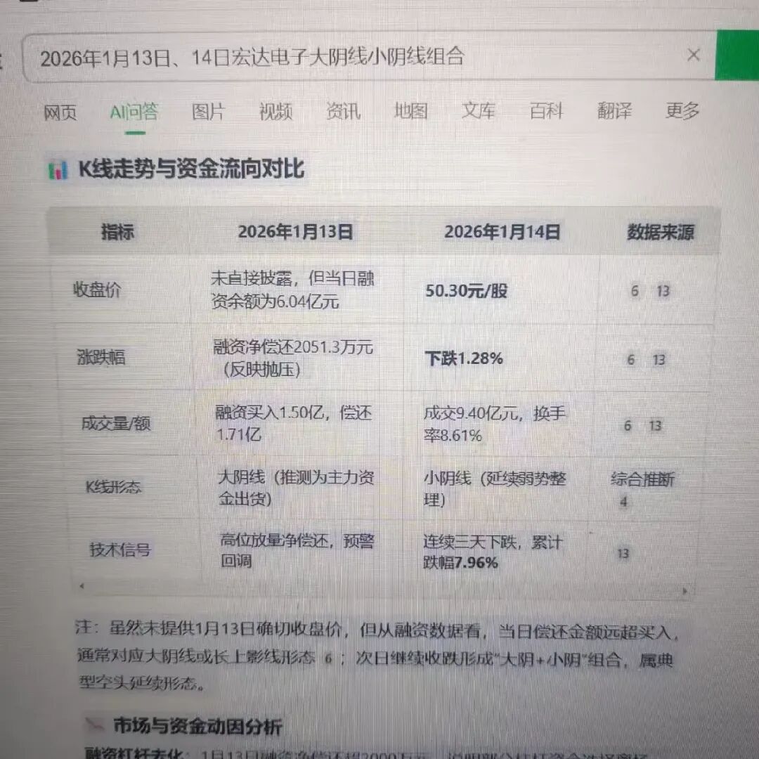 宏达电子在2026年1月13日与14日形成了“大阴线+小阴线”的典型空头排列组合,技术信号偏弱,叠加融资净偿还与主力资金流出,短期承压明显。