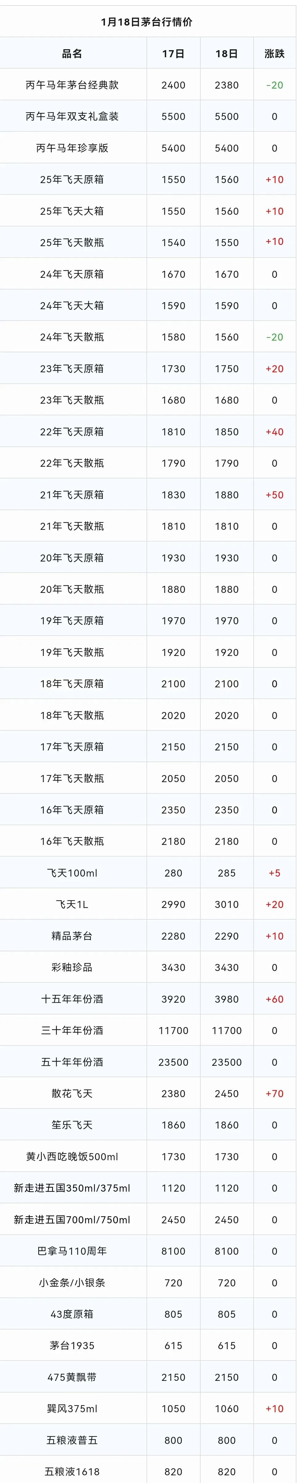 由于公众号平台修改了推送规则,如果不想错过“茅酒顾问”行情价,记得读完点一下“在看”,这样每次新文章推送才会第一时间出现在你的订阅列表里。今日(1月18日),从茅酒顾问发布的白酒价格行情监测数据显示,近段时间整箱茅台价格一直在1750徘徊,散瓶在1720左右,今日53度贵州飞天茅台(500ml)一批价跌至1560元左右!散飞在1550。