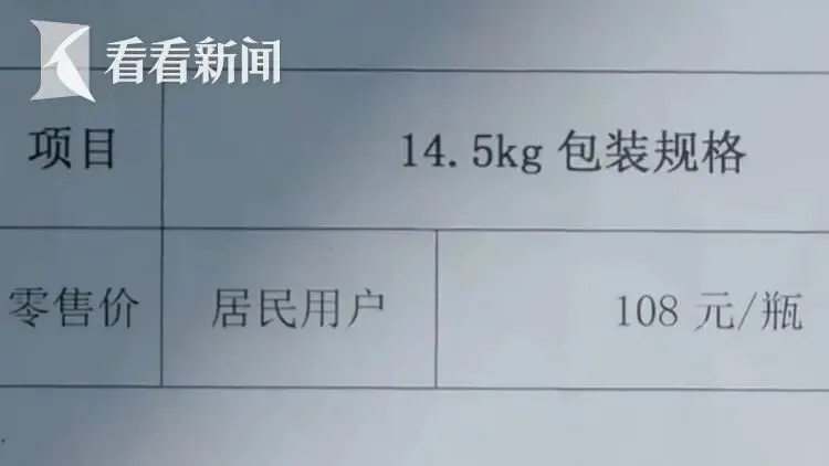 在业务窗口,看看新闻Knews记者看到了上周发布的价格通知,当前,这家公司14.5公斤规格的瓶装液化气零售价为每瓶108元,不包括配送费。