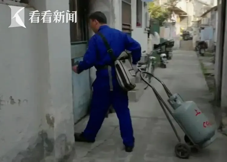 在浦东南塘村这片居民区,由于机动车难以通行,配送员配送时都用小推车步行前往,为居民核对信息后进行瓶装气的接装,并对灶、管、阀等进行常规安检。