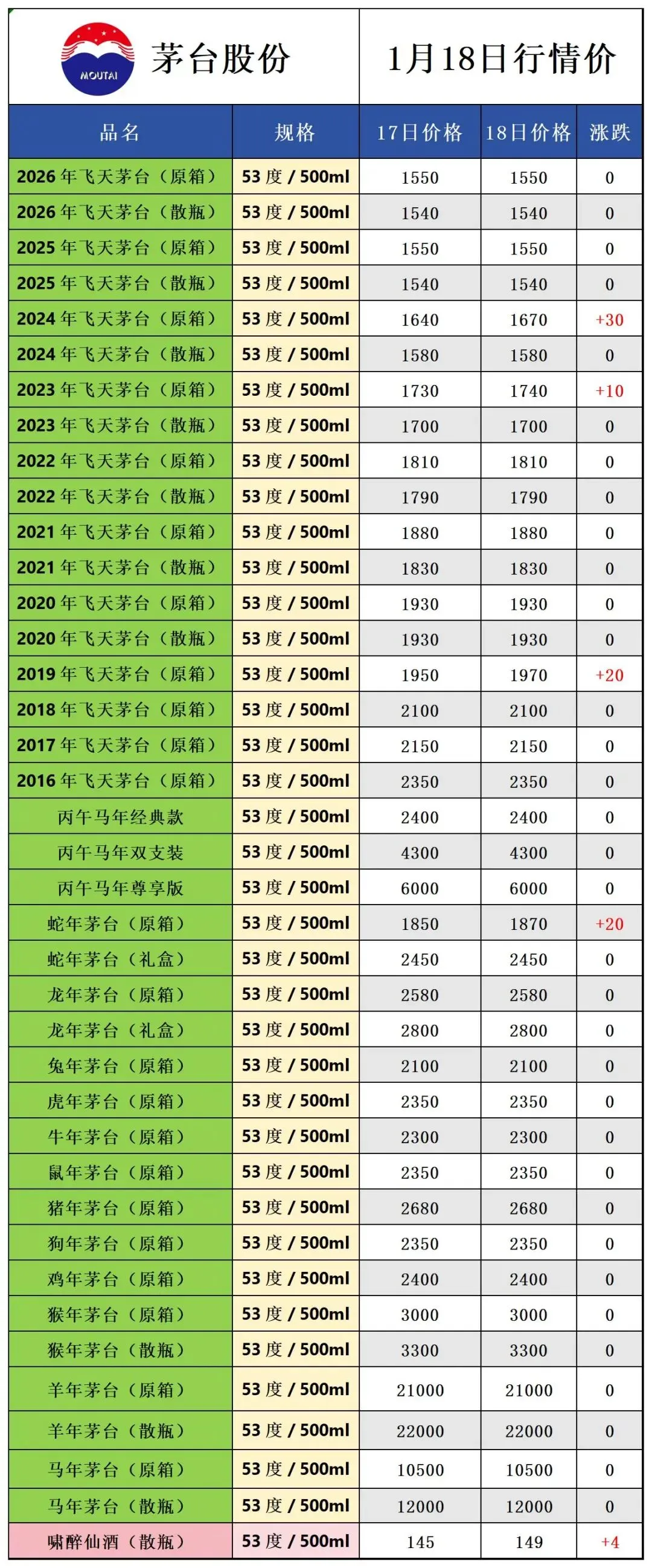 因各地行情有所不同,价格仅供参考!每天更新茅台价格,飞天茅台相关热点资讯,由于平台修改了推送规则,如若不想错过白酒市场行情报价参考, 请点击文章右下角的“在看”,推送会第一时间出现在订阅列表里,谢谢各位茅粉!