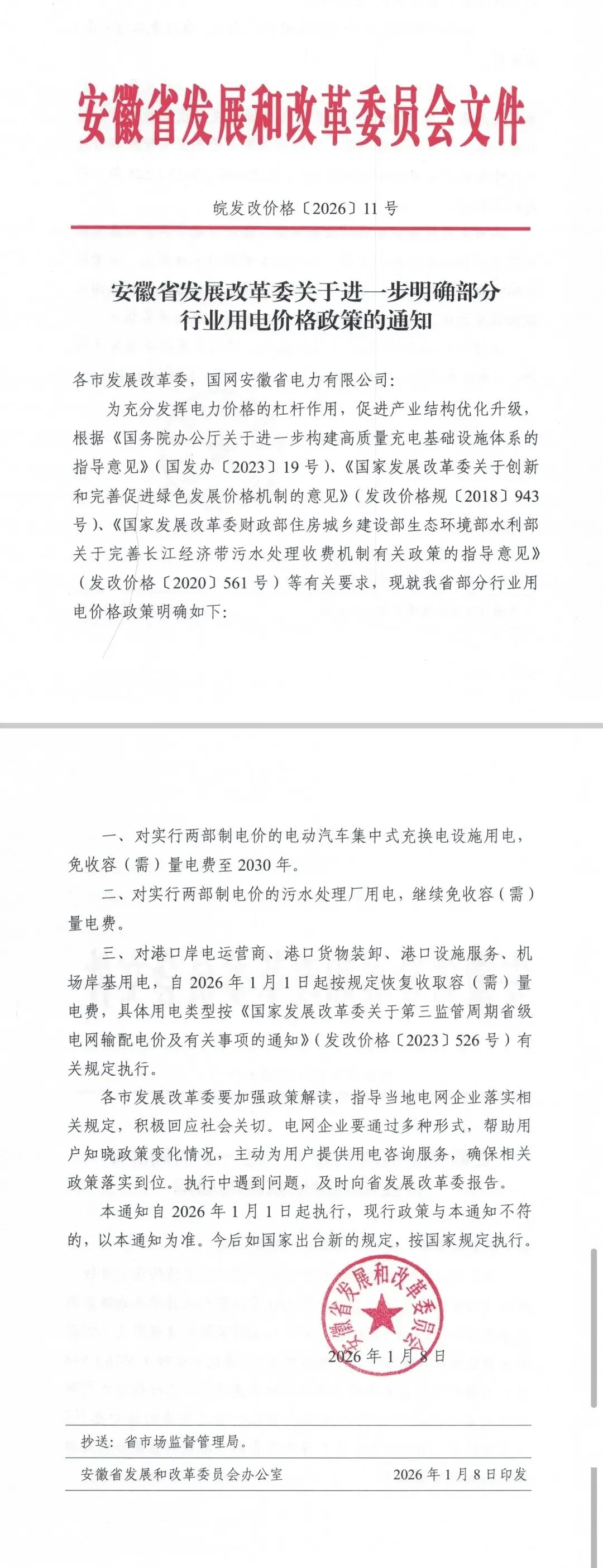 >安徽省发展改革为关于进一步明确部分行业用电价格政策的通知(皖发改价格【2026】11号)