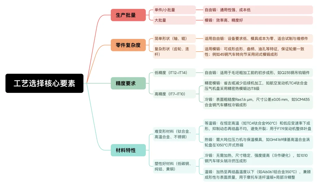 “自由锻vs模锻,到底该怎么选?不同场景的性价比之王是它!” 这是行业内最常见的选择难题,核心判断逻辑就3个:生产批量、零件复杂度、精度要求。为了帮你快速决策,我们整理了工艺选择思维导图: