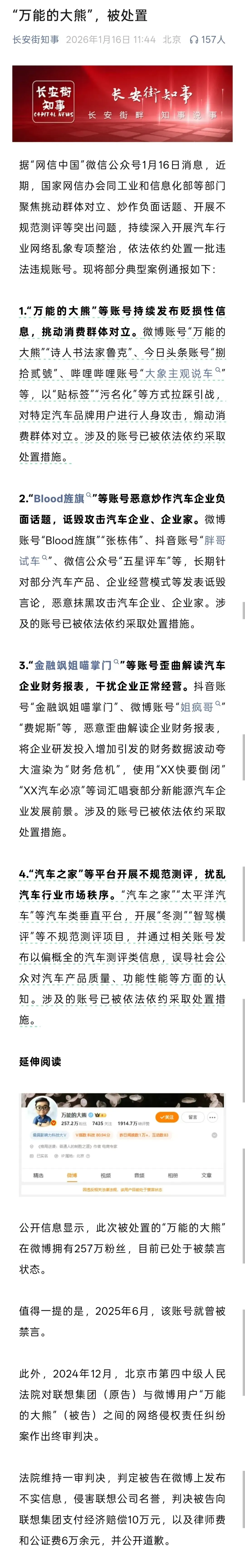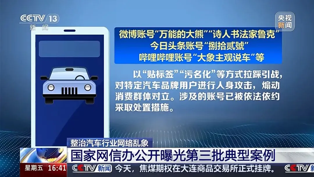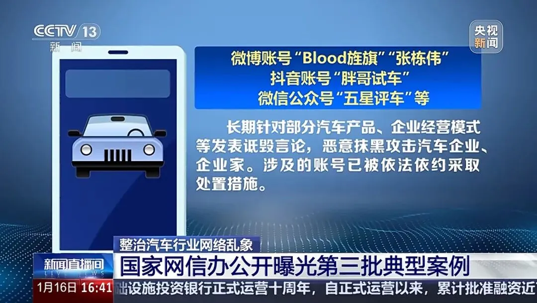 近期,国家网信办会同工信部等部门持续推进汽车行业网络乱象专项整治,针对“挑动群体对立、炒作负面话题、不规范测评”等问题,依法处置了一批违规账号和平台。1月16日,“网信中国”公开了第三批典型案例,具体情况如下:
