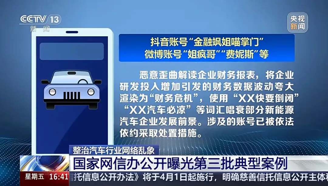 抖音“金融飒姐喵掌门”、微博“姐疯哥”“费妮斯”等账号,恶意曲解汽车企业财务报表,将“研发投入增加导致的财务波动”渲染为“财务危机”,用“XX要倒闭”等话术唱衰新能源车企,已被采取处置措施。