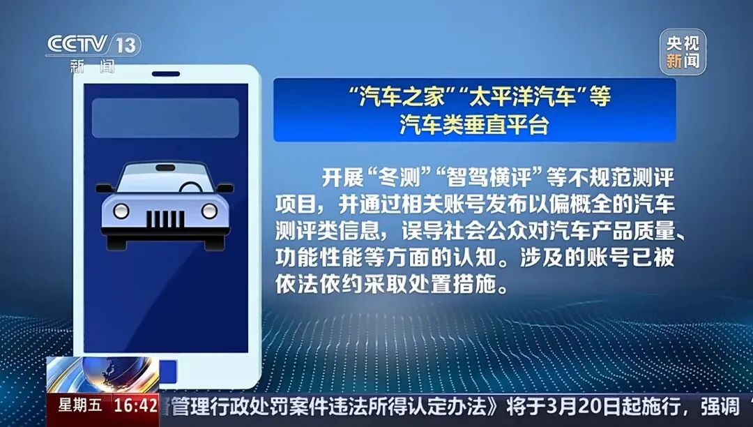 “汽车之家”“太平洋汽车”等垂直平台,开展“冬测”“智驾横评”等不规范测评项目,发布“以偏概全”的测评信息,误导公众对汽车产品的认知,扰乱行业市场秩序,相关账号已被处置。