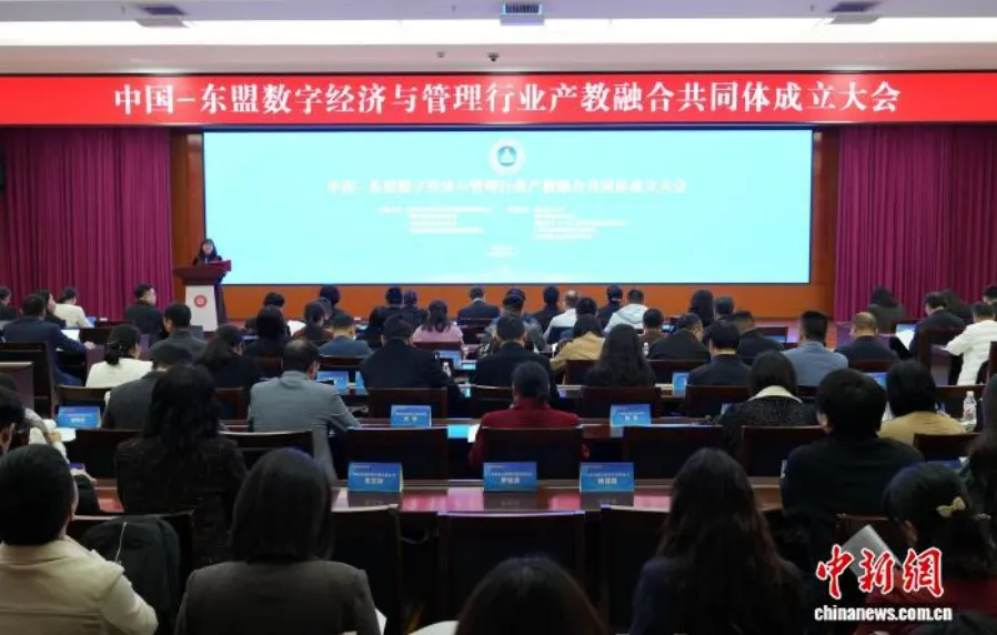 中国—东盟数字经济与管理行业产教融合共同体由全国电子商务职业教育教学指导委员会、广西壮族自治区教育厅、广西壮族自治区商务厅、广西商业职业教育教学指导委员会联合指导,南宁职业技术大学、武汉理工大学、颜值立方(广西)服务贸易集团有限公司等单位牵头组建,汇聚国内外院校、企事业单位、行业协会及科研机构等多方力量。目前,共同体已吸引186家单位踊跃加入,形成了覆盖政产学研用的多元协作网络。