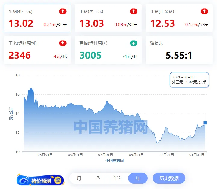 2026年1月18日全国外三元均价13.02元/公斤,今日猪价较昨日报价上涨了0.21元/公斤。
