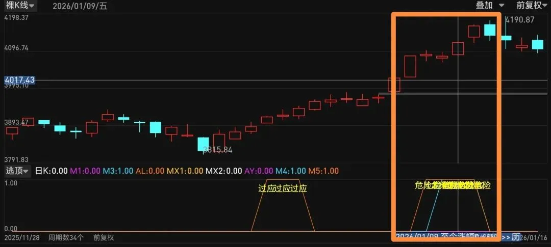 在1月10日发布了一个指标波段之门KDJ逃顶指标,那时候大盘K线还是16连阳
