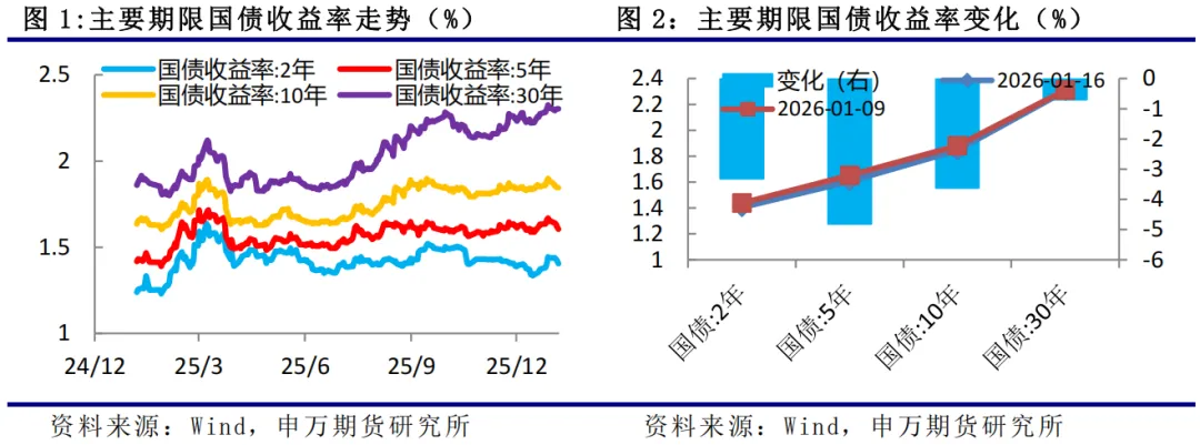 1、国债期货价格普遍上涨。其中TS2603合约价格上涨0.06%,TF2603合约价格上涨0.22%,T2603合约价格上涨0.28%,TL2603合约价格上涨0.26%。对应的2年期国债收益率下行3.32bp,5年期国债收益率下行4.81bp,10年期国债收益率下行3.62bp,30年期国债收益率下行0.7bp。