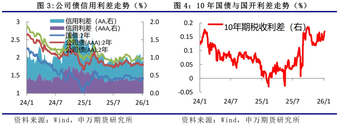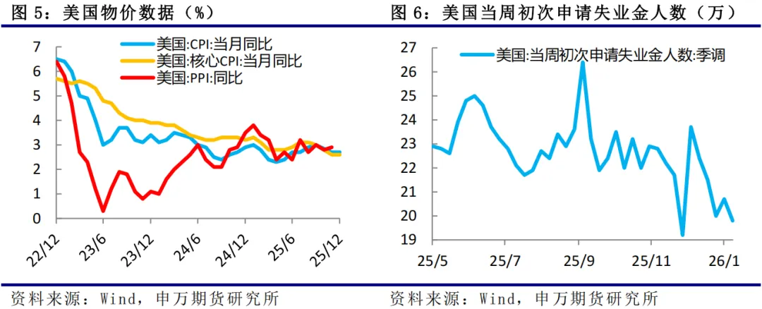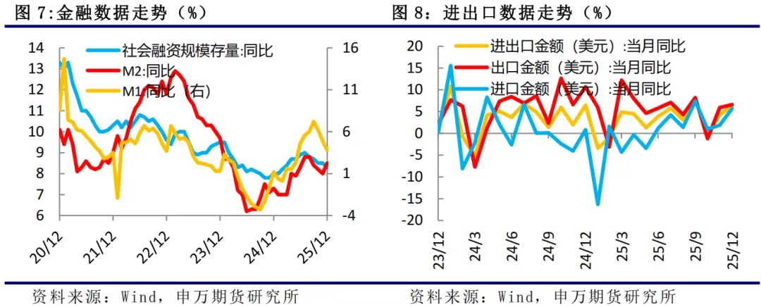 (2)国内经济:以美元计价,2025年12月出口同比增长6.6%,进口同比增长5.7%,均较11月提升,贸易顺差1141.4亿美元,同比增长8.5%;单月贸易顺差创年内次高,12月数据显示外贸“韧性十足”,出口结构升级与区域多元化有效对冲全球经济不确定性。12月份居民户短期贷款继续减少,中长期贷款处于低位,政府债券融资回落;不过企业短期和中长期贷款均有所增加,融资结构有所优化,社融存量同比增速为8.3%。