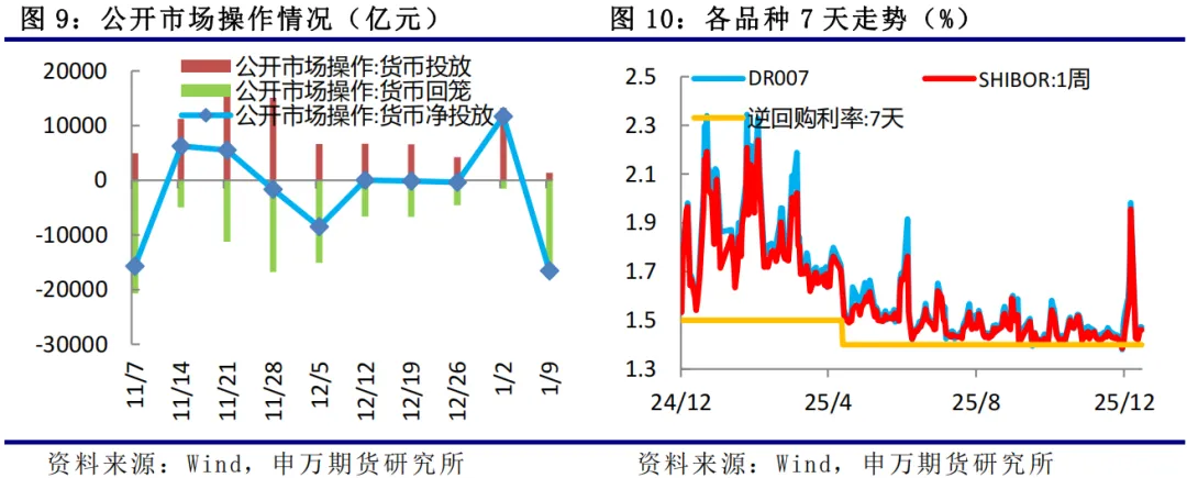 本周国债期货价格上涨,信用利差扩大,央行公开市场逆回购净投放8128亿元,Shibor品种有所上行,隔夜利率处于1.3%上方,证券交易所提高融资保证金比例,市场风险偏好回落。美国上周初请失业金人数下降9000人至19.8万人,显著低于市场预期,美联储2026年票委卡什卡利主张1月维持利率不变,美债收益率回升。12月出口同比增长 6.6%,较上月增幅进一步扩大;进口同比增长 5.7%,大幅高于前值,且双双超出市场预期,进出口数据表现亮眼,呈现加速回暖态势;12 月社融存量同比 8.3%,M2 同比继续高增,剪刀差扩大。