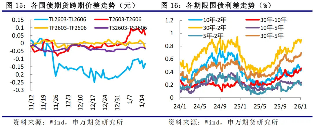 (4)基差结构:债券净融资额回落,从各机构持仓来看,本周T合约价格上涨,机构净多持仓减少,全市场日均成交量回落,持仓量小幅增加。