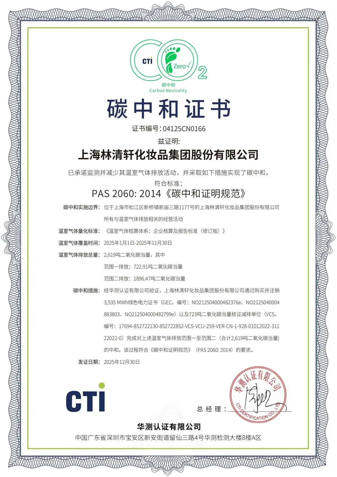 华测认证的核查声明(证书号:04125GHGP0024)显示,此次认证严格遵循ISO 14064-3等国际标准,达到“合理保证等级”。
